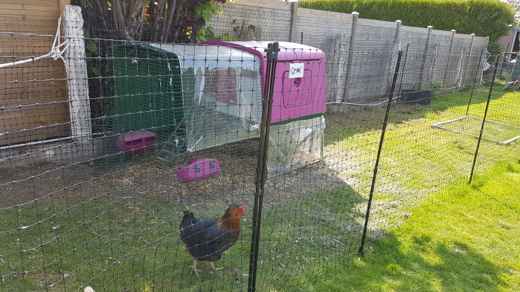 Caption: Paars Eglu Cube groot kippenhok en ren in de tuin met kippen en Omlet kippenhek