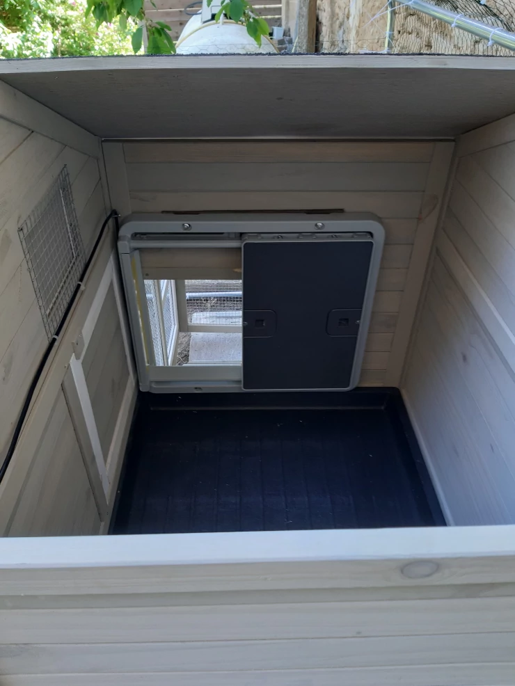 Caption: Binnen houten kippenhok met Omlet grijze automatische kippenhok deur