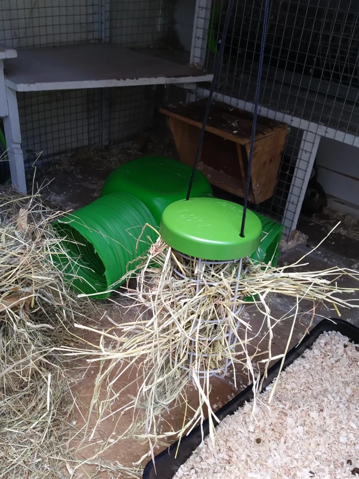 Caption: Niet alleen voor kippen, briljante hangende hooiruif voor konijntjes