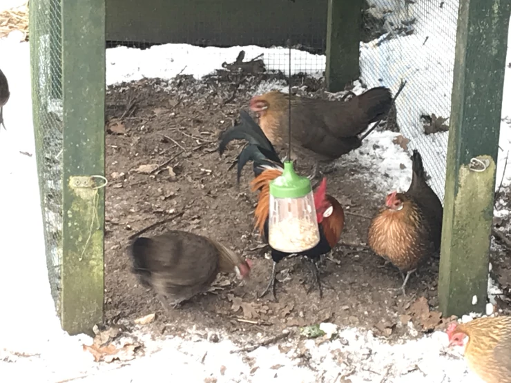 Caption: Kippen vinden het een leuk speeltje, het voer valt er makkelijk uit wanneer ze er tegen aan pikken