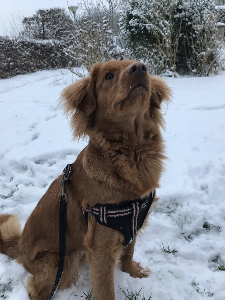 Caption: Heel mooi en makkelijk tuigje. Onze Toller van 15 kg heeft maat M