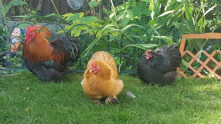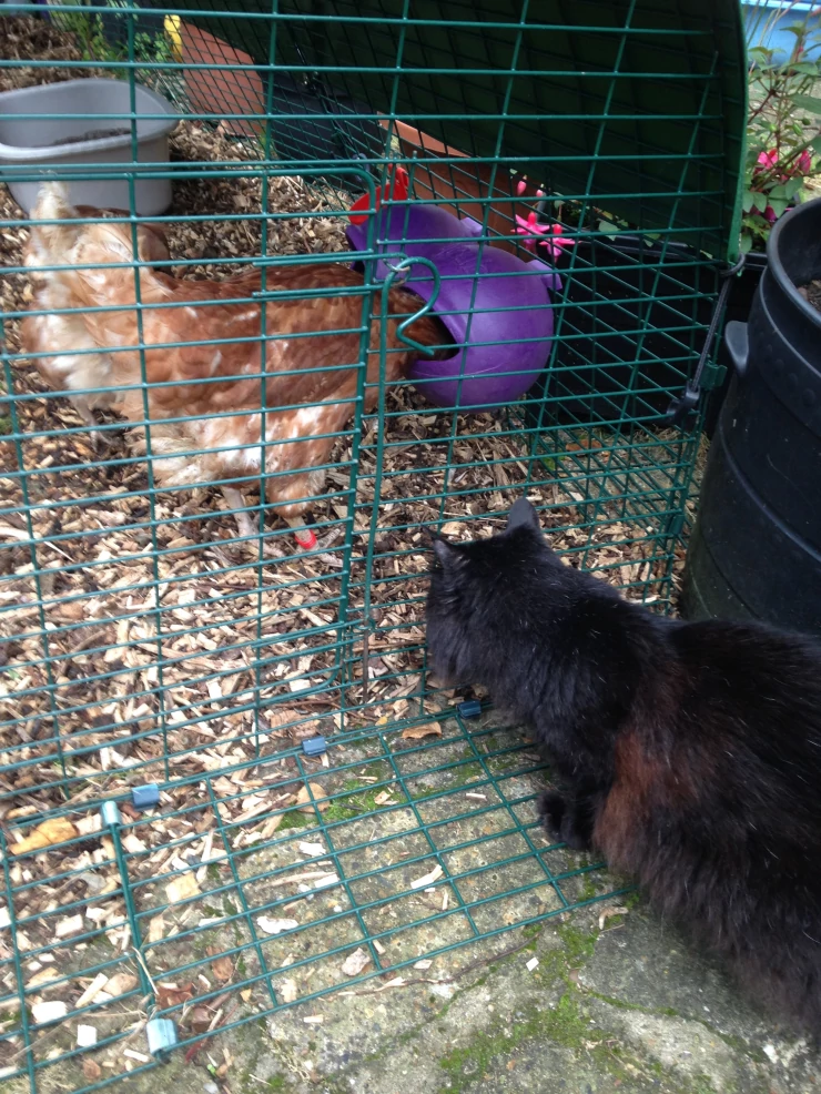 Caption: Absynthe ontmoet voor het eerst haar nieuwe kippenvrienden!