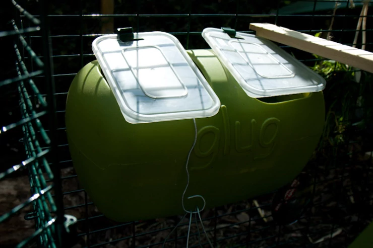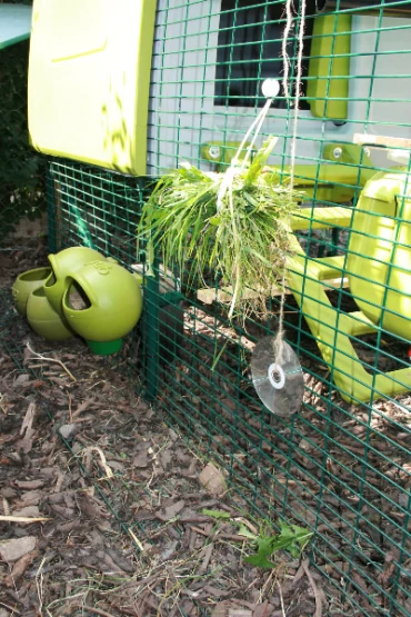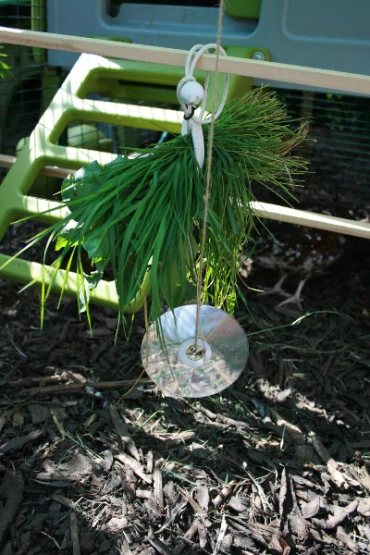 Caption: Zorg ervoor dat het hoog hangt en dat de strengen in het midden worden geschoren. kippen mogen geen lange strengen gras eten omdat ze dan "kropgebonden" kunnen worden, wat niet Good...