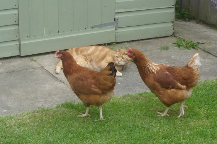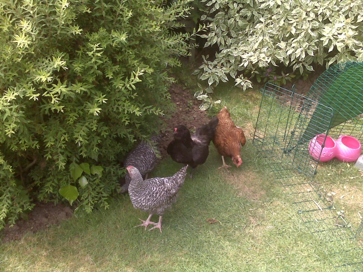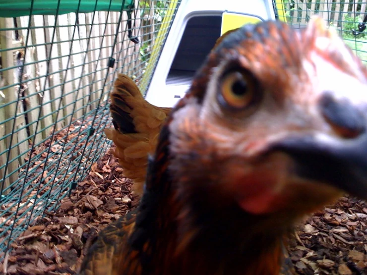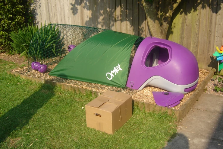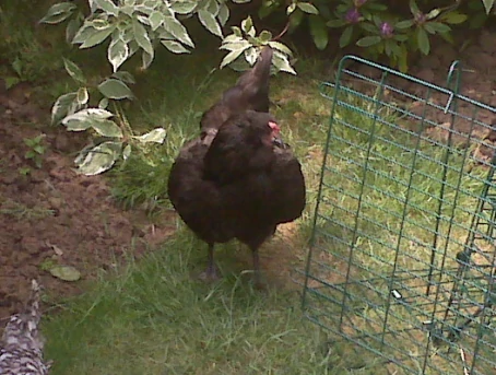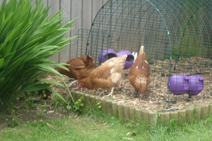 Caption: 8.5 vierkante meter. een Cube, een Eglu en vier gelukkige kippen. twee zitstokken gemaakt van striphout in de Cube, afgerond om hun voeten te beschermen en aangenamer voor hen gemaakt. 1 zitstok in ren gemaakt van 1.5 "zwarte keukenafval pijp. alle z