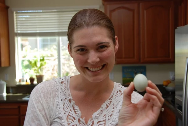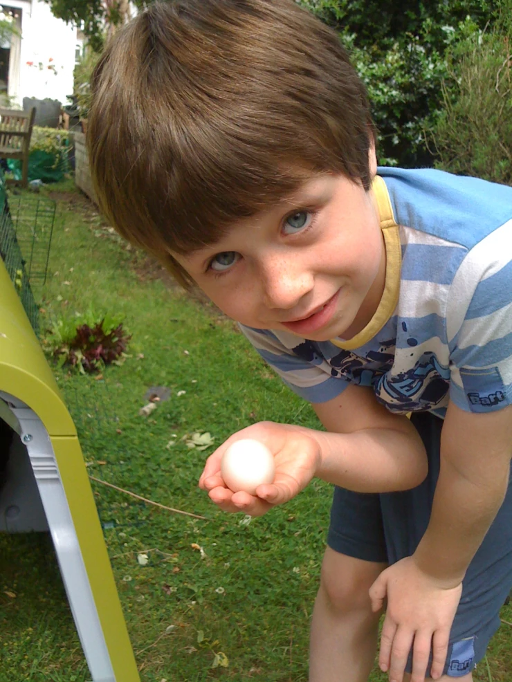 Caption: 10 dagen nadat rosie en flo zich bij onze familie hebben gevoegd, hebben we twee eieren gekregen. het eerste praktijk ei was zo zacht dat het in de valbak viel. hier is het perfecte tweede! Goed gedaan, rosie...
