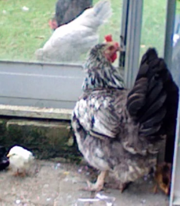 Caption: Machine...silver sussex (2008-heden) niet een van mijn beste hennen, ik vermoed dat ze een hybride sussex is in plaats van een raszuivere. ze is een echte verenpikker en tussen haar en mijn amberlinks, ze verorberen alles!