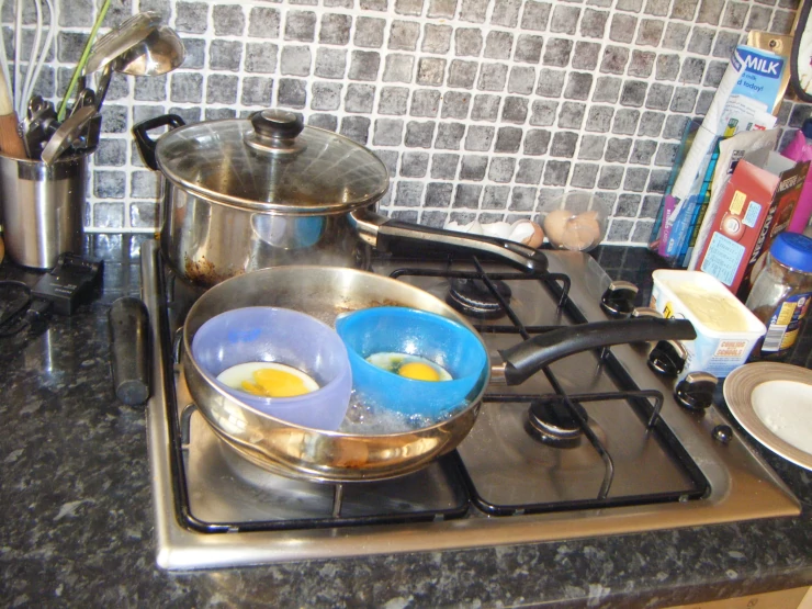 Caption: Onze eerste eieren worden gepocheerd, 4 bantie eieren.