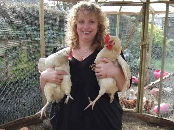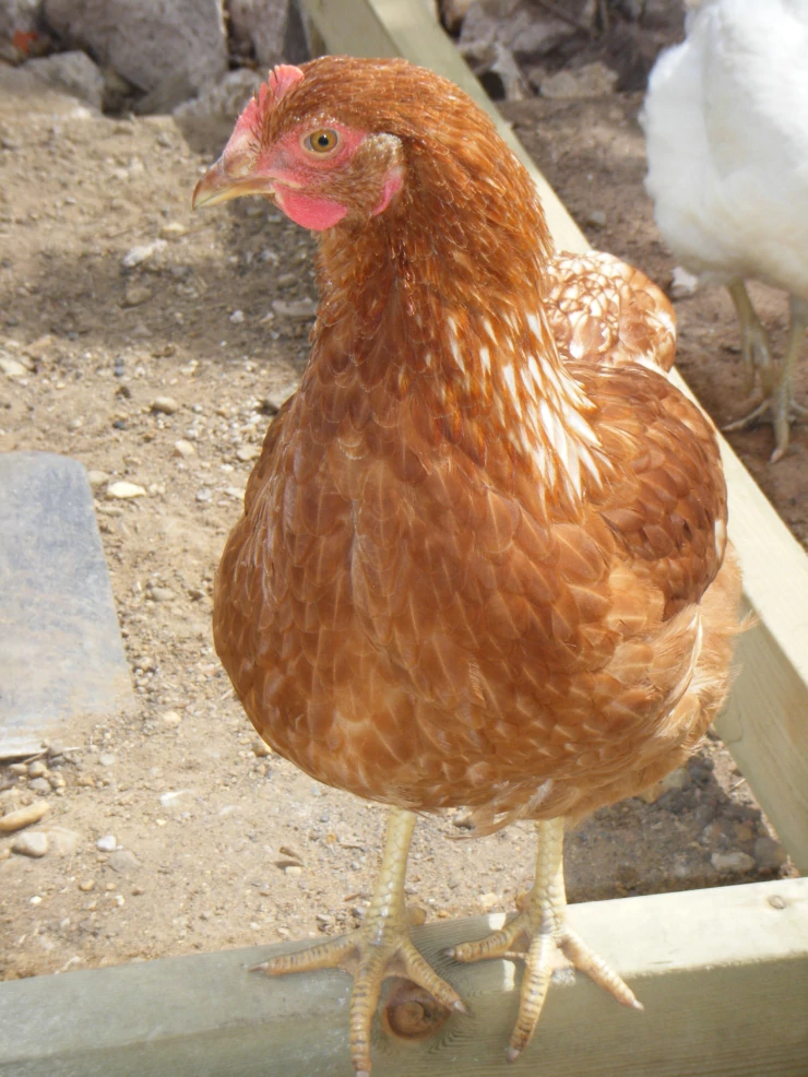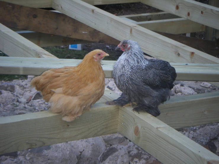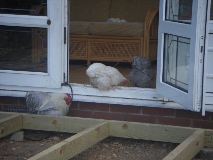 Caption: Terwijl mijn man het dek aan het leggen was, kwamen de kippen naar Go om in het huis te kijken.